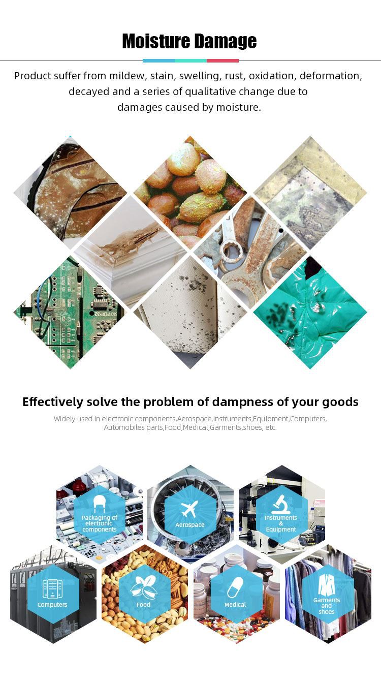 Mitrums un skābeklis var ietekmēt produktu ķīmisko vai fizikālo stabilitāti,pat iepakojuma materiālos produkti ir pakļauti mitrumam un skābeklim, kas var iekļūt iepakojumā no ārējās vides. Tātad silikagela desikants tiek izmantots mitruma absorbēšanai noslēgtā vidē, lai nodrošinātu produktu kvalitāti un pagarinātu to glabāšanas laiku.