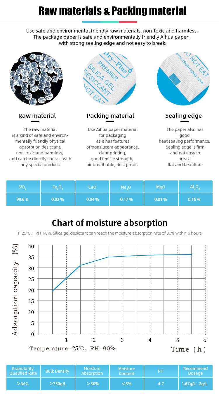 Silikagels ir augstas aktivitātes absorbents, kas spēj absorbēt vairāk nekā 30% mitruma no tā svara. Un tas ir vienīgais materiāls, kas var tieši saskarties ar pārtiku un farmaceitiskajiem produktiem ar FDA apstiprinājumu.
